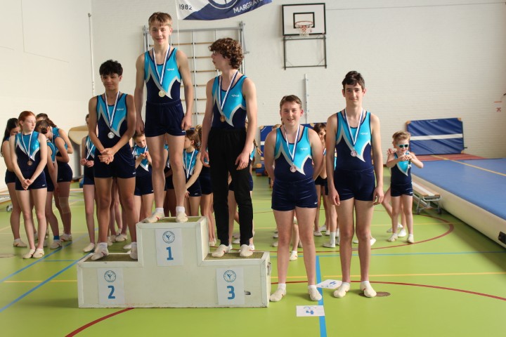 Door het grote aantal deelnemers werd de dag opgesplitst in 3 blokken, nl blok 1 in de morgen en blok 2 en 3 in de namiddag. Vooral blok 1 werd onder grote publieke belangstelling afgewerkt. In de namiddag werd het programma voor de oudere groepen voortgezet. Hier werden zeer goede en moeilijke oefeningen op de mat en de trampoline neergezet. De jury had in alle blokken de zeer moeilijke taak om de juiste prijs toe te kennen, maar uiteindelijk kon elke deelnemer een 1e-2e-3e of 4e prijs in ontvangst nemen. Onderstaand de uitslagen.